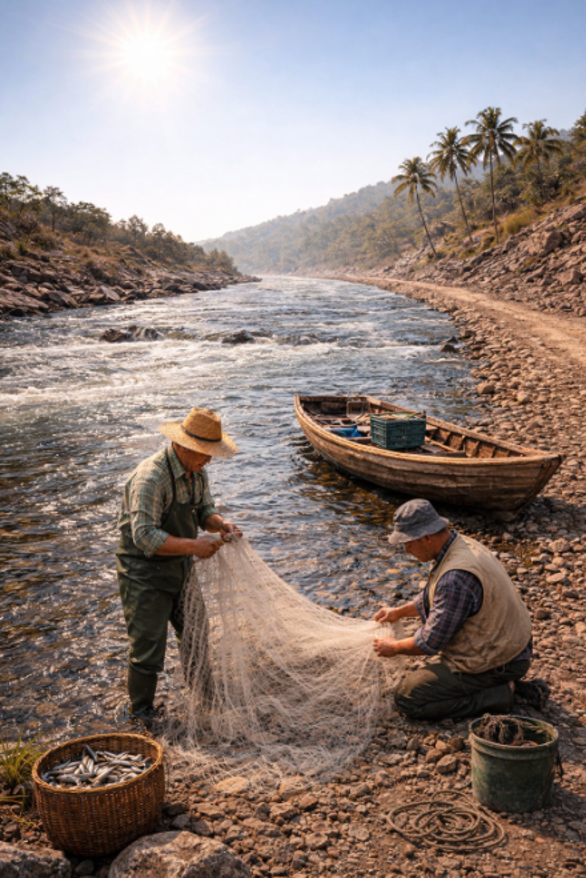 তোমাৰ ভাপ-নাওঁ চলে । জালত ছট-ফটায় ৰূপোৱালী মাছ ।